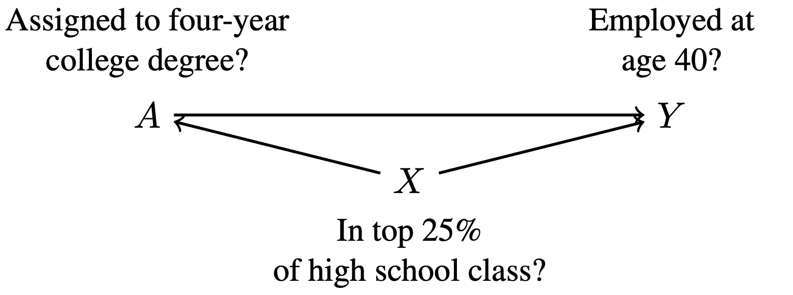 - \((A\text{: college degree})\leftarrow (X\text{: top 25\% of high school class})\rightarrow (Y\text{: employed at age 40})\)