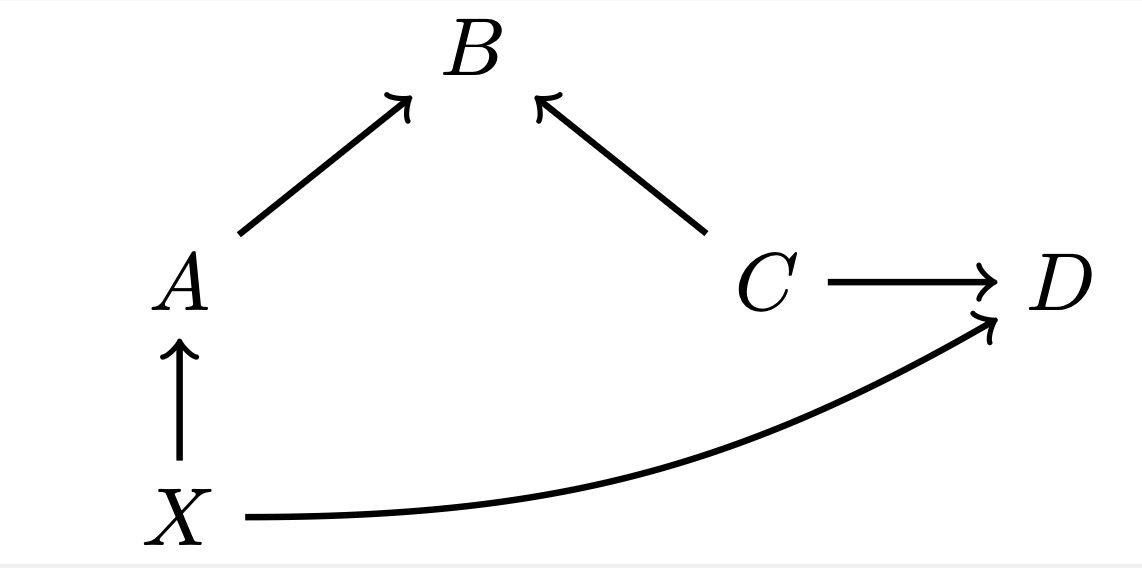 - \(\cancel{A\leftarrow \boxed{X}\rightarrow D}\) (blocked by conditioned non-collider \(X\))