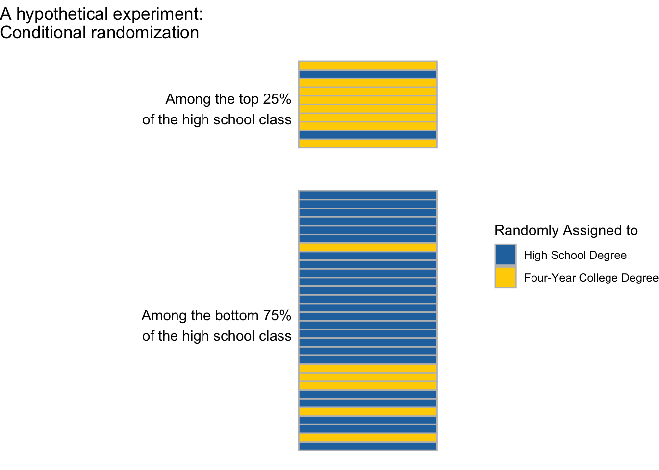 Even though exchangeability does not hold marginally (across everyone), in a conditionally randomized experiment exchangeability does hold within subgroups. If we focus on those in the top 25% of the class, the 90% who are assigned to finish college are a simple random sample of the entire higher-performing subgroup. If we focus on those in the bottom 75% of the class, the 10% who are assigned to finish college are a simple random sample of the entire lower-performing subgroup.