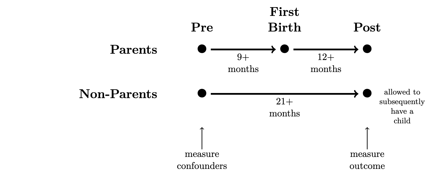 observation_idis an index for each observationsampling_weightis the weight due to unequal probability samplingtreatedindicates a first birth (TRUEorFALSE)- This occurred between the pre- and post-periods.