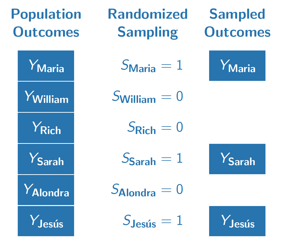 Why do probability samples like this work? They work because selection into the sample (\(S = 1\)) is completely randomized and thus independent of the outcome \(Y\). In other words, the people who are sampled (\(S = 1\)) and the people who are unsampled (\(S = 0\)) have the same distribution of outcomes (at least in expectation over samples). We might say that the sampled and the unsampled units are exchangeable in the sense that they follow the same distribution in terms of \(Y\). In math, exchangeable sampling can be written as follows.