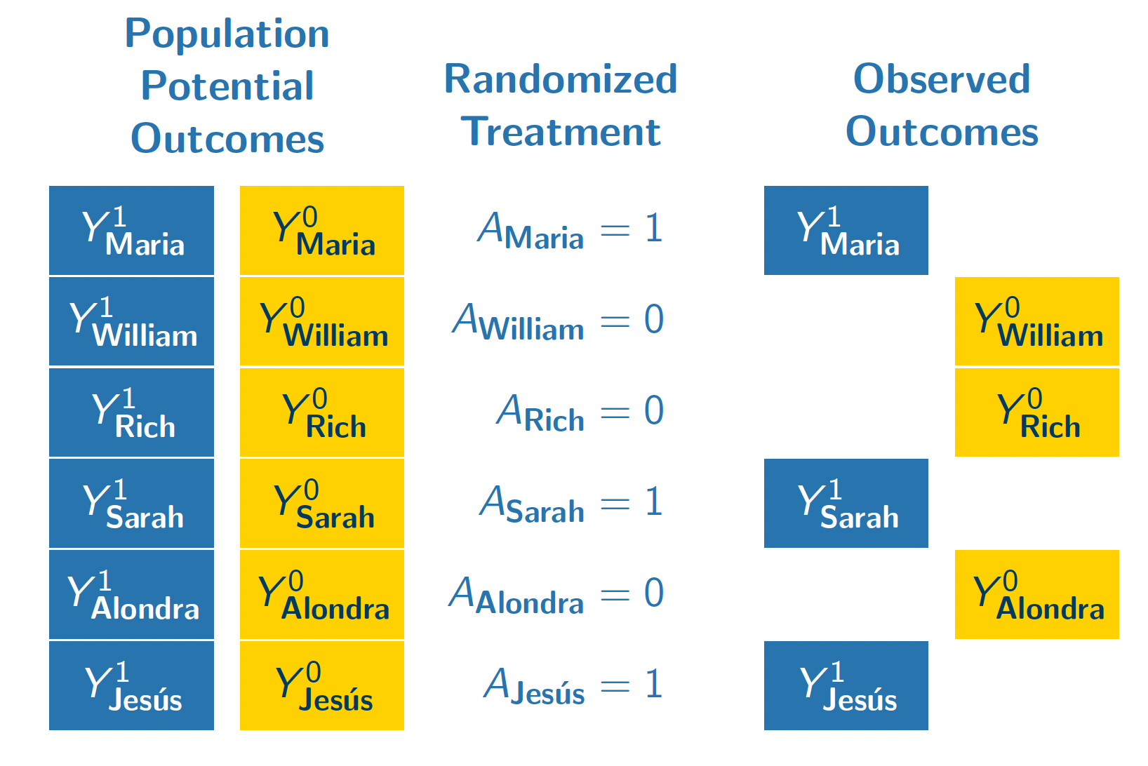 In this randomization, Maria, Sarah, and Jes'us were randomized to attain a four-year college degree. We observe their outcomes under this treatment condition (\(Y^1\)). Because treatment was randomized with equal probabilities, these three units form a simple random sample from the full population of 6 people. We could use the sample mean of \(Y^1\) among the treated units (Maria, Sarah, Jes'us) as an estimator of the population mean of \(Y^1\) among all 6 units.